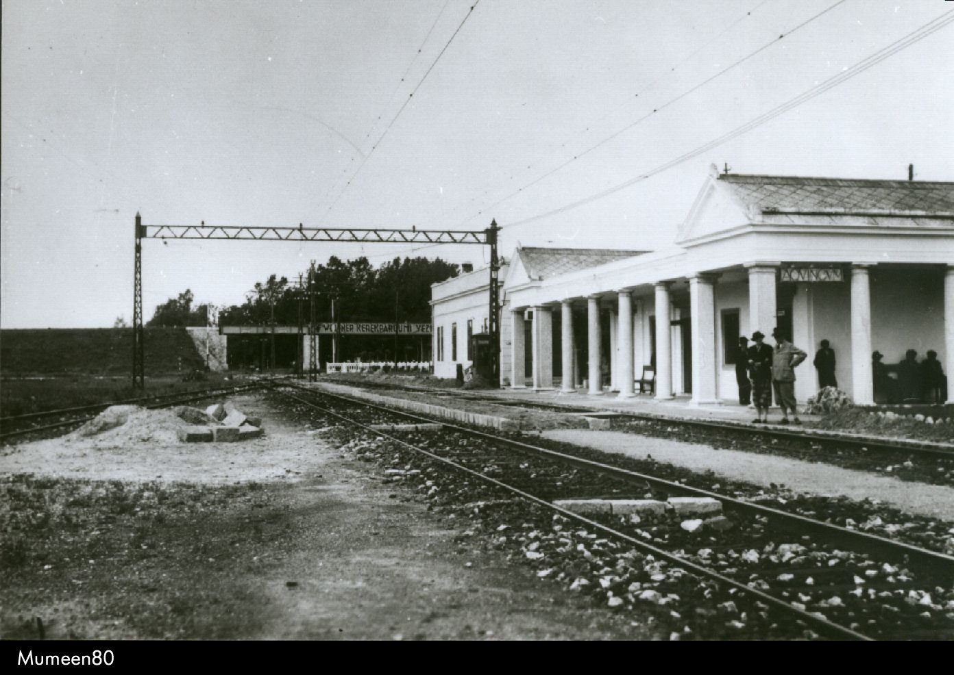 A régi aquincumi HÉV-megálló épülete, ami az Aquincum múzeummal szemben, az elágazásnál állt. Háttérben az esztergomi vasútvonal Szentendrei út fölött átívelő hídja.