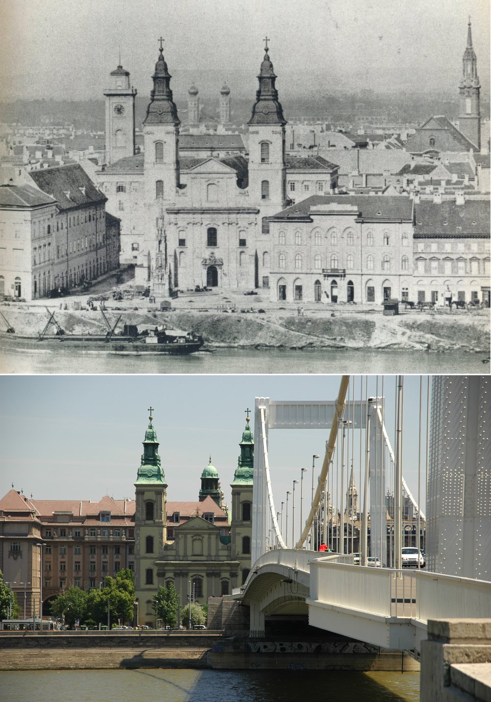 Belvárosi Plébániatemplom, Erzsébet híd akkor és most