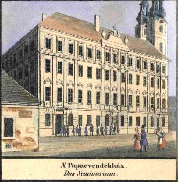 A Belváros 1837-ből, Vasqueztől származó, mellékelt térképén (Észak jobbkéz felé) kék négyszögben emeltem ki a Szeminárium teret és az egyetemet. Bal oldalon a Heu Markt (Szénapiac, ma Kálvin tér) az evangélikus (ma református) templommal, a Kecskeméti utca és a Land Strasse (Országút, ma Múzeum körút) összefutásával. Alul a Nemzeti Múzeum, jobbra a Ferenciek tere.