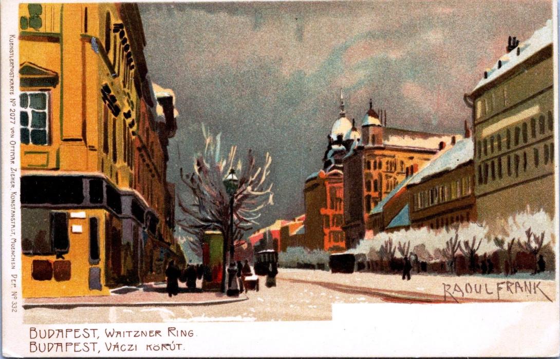 A kép jobboldalán az 1882-re felépült Fronciére-palota, baloldalán az 1905-ben felszentelt Szent István Bazilika, jobboldali szélén a milleniumi földalatti vasút lejáróházának bejárata látható. Az úton már 1866-tól használta a vágányokat a lóvasút, majd 1896-tól a villamos.